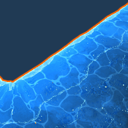 텍스처 흐름/왜곡을 기반으로 프레넬 밝음 + 파도 결 + 미세 반짝임 + 해안선 발광을 순차 합성하는 Stylized 수면.